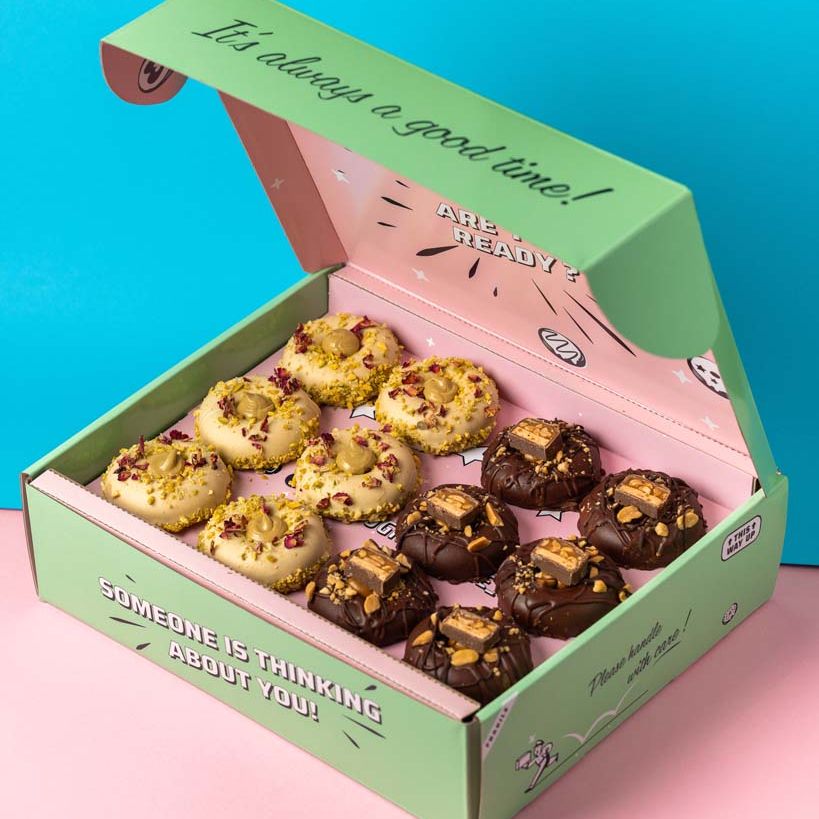 Unsere Doughnuts werden am Versandtag frisch gebacken, von Hand verziert und sorgfältig in unseren Geschenkboxen verpackt. Somit bleiben die Doughnuts bis zu vier Tage frisch und genießbar.