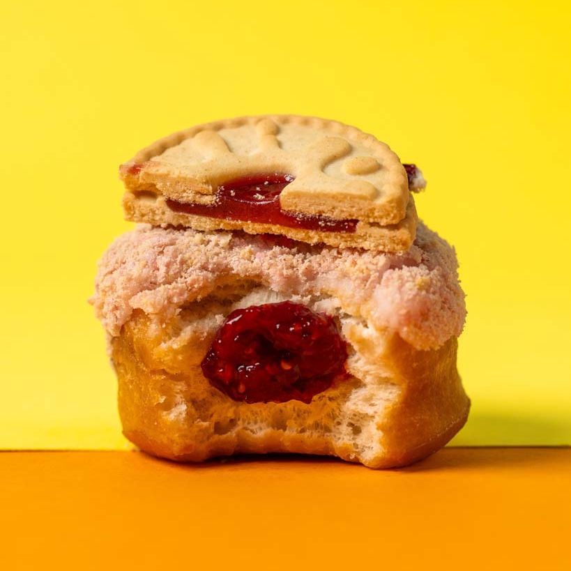 Ball-Donut mit Himbeermarmelade gefüllt, in Erdbeerglasur getaucht, in Waffel-Krümel gedipt, und mit mehr Marmelade, Buttercreme und einem Jammy Dodger Keks verziert.