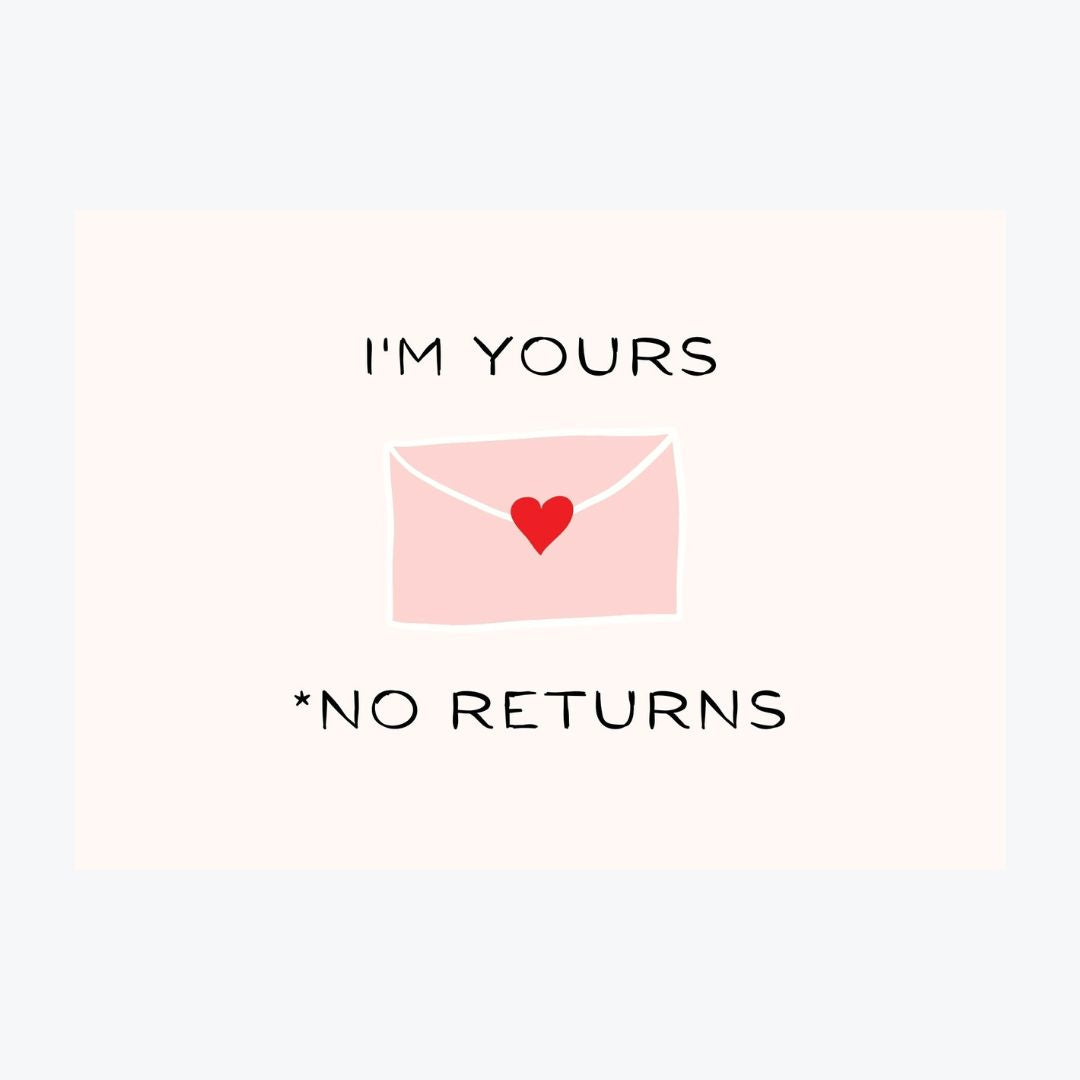[{"id":47794772738327,"title":"Default Title","option1":"Default Title","option2":null,"option3":null,"sku":"-1","requires_shipping":true,"taxable":true,"featured_image":null,"available":true,"name":"Karte \"I'm Yours, No Returns\"","public_title":null,"options":["Default Title"],"price":495,"weight":100,"compare_at_price":null,"inventory_management":"shopify","barcode":null,"requires_selling_plan":false,"selling_plan_allocations":[]}]